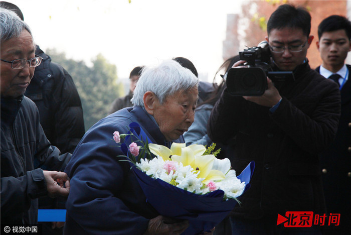 12月9日,江苏省南京市,南京大屠杀幸存者杨翠英老人向罹难亲人敬献鲜花。