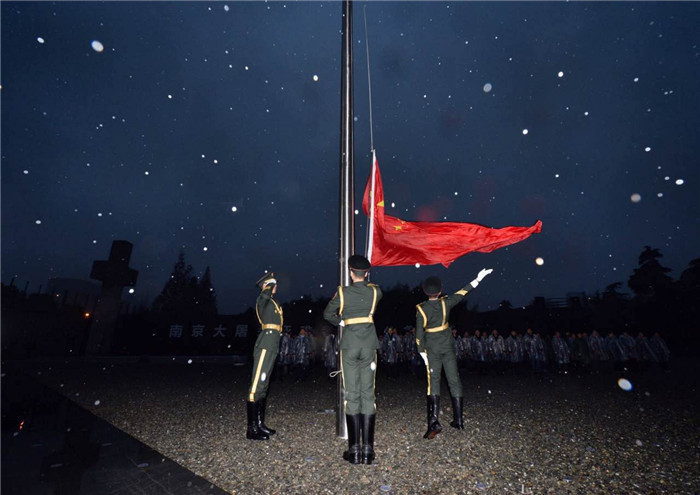 12月13日晨,7时整。天刚蒙蒙亮,清冽空气带着寒意,天空下起小雨。在南京大屠杀死难者国家公祭仪式举办地——侵华日军南京大屠杀遇难同胞纪念馆内,举行升国旗和下半旗仪式。