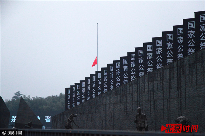 在南京大屠杀死难者国家公祭仪式举办地——侵华日军南京大屠杀遇难同胞纪念馆内,举行升国旗和下半旗仪式。