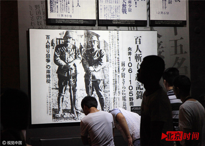 8月12日,江苏省南京市,人们在侵华日军南京大屠杀遇难同胞纪念馆参观,背景图片为当时日本国内媒体报道侵华日军百人斩的新闻。